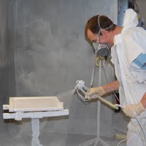 Sprøjteværkstedet løser typisk behandling af inventar, som underentreprise for træ- og møbelindustrien, samt renovering af især køkkenlåger, døre og møbler.